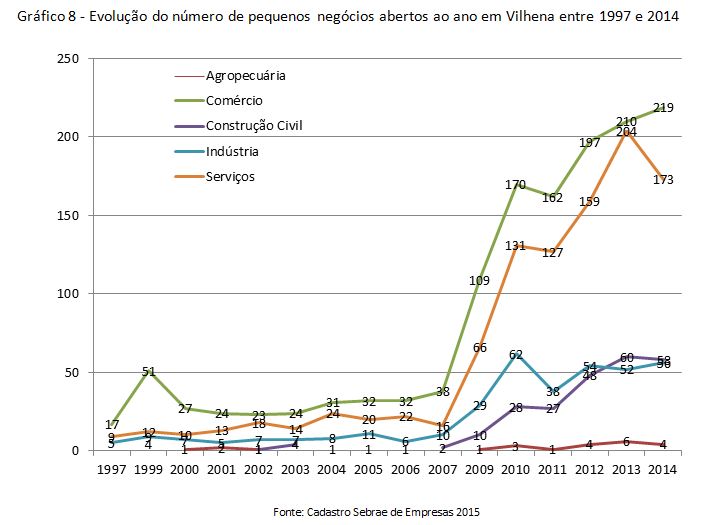 De acordo com o Cadastro Sebrae de Empresas (CSE), em 2015 havia em Vilhena 4.514 pequenos negócios formalizados (com Cadastro Nacional de Pessoas Jurídicas – CNPJ ativo), dos quais 10,21% eram empresas de pequeno porte (EPP), 44,4% eram microempresas e 45,39% eram microempreendedores individuais (Gráfico 5 e Tabela 2). Quanto ao setor econômico, quase 0,6% pertencia ao agronegócio, pouco mais de 8% pertenciam à construção civil, praticamente 11% eram indústrias, quase 38% eram de serviços e pouco mais de 42% eram do comércio (Gráfico 6 e Tabela 2).