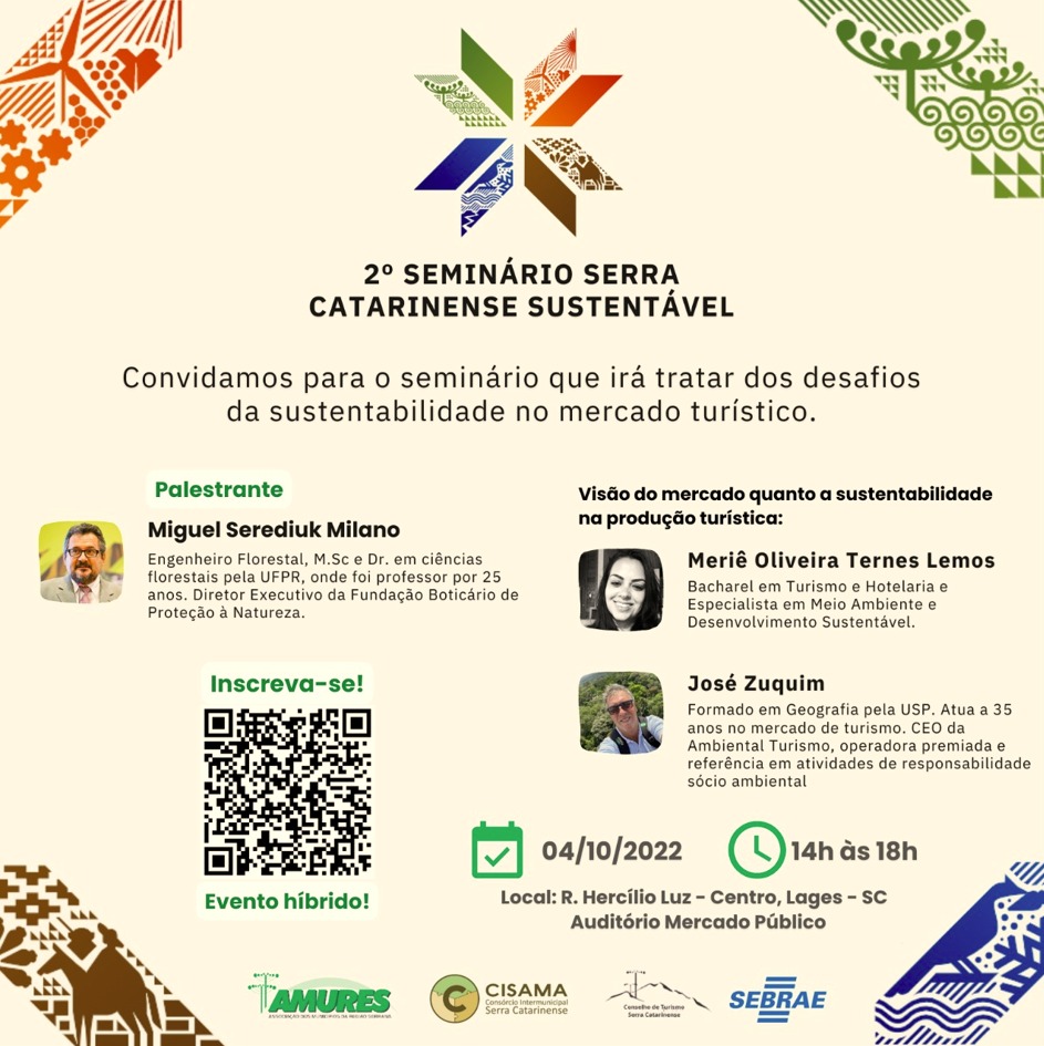 Lages – 29/09/2022 - Seguindo a proposta de atender às necessidades e do enfoque de sustentabilidade, acontece o segundo Seminário Selo Serra Catarinense Sustentável. Será no espaço do Mercado Público Municipal, no dia 04 de outubro, numa terça-feira, com início às 14 horas. Na ocasião, serão tratados temas abordando os desafios da sustentabilidade no mercado turístico, e serão repassadas as informações atualizadas, dentro da premissa da identificação já feita pelas consultorias do programa de certificação das empresas. O evento acontece de forma híbrida.
