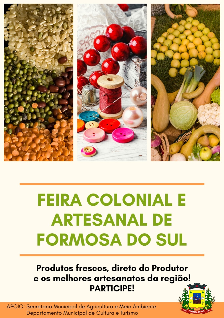 Exemplos dessas ações são a Feira Colonial e Artesanal com produtos frescos e os melhores artesanatos da região e o Ciclo Formosa, um percurso de 35 quilômetros de pedalada. A primeira iniciativa acontecerá neste sábado (12), das 9 às 16 horas, na Praça Municipal, com apoio da Secretaria Municipal de Agricultura e Meio Ambiente e do Departamento Municipal de Cultura e Turismo.