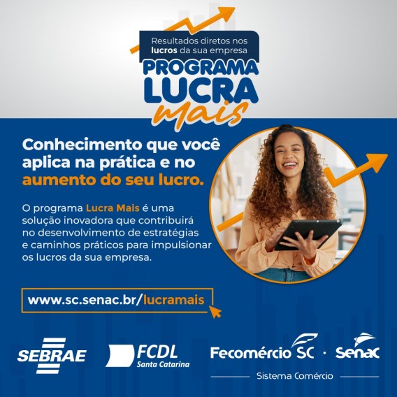 O programa Lucra Mais está com turma aberta para o município de Brusque. São 30 vagas de forma gratuita e as inscrições podem ser feitas no site do programa acessando o link https://www.sc.senac.br/lucramais/. Realizado em parceria entre o Senac, a Fecomércio, a FCDL e totalmente subsidiado pelo Sebrae de Santa Catarina, o programa tem como objetivo fortalecer o desempenho financeiro das Microempresas (ME) e Empresas de Pequeno Porte (EPP) em todo o estado, atuantes nos setores de Comércio e Serviços, promovendo a inovação e crescimento lucrativo. Uma iniciativa pioneira, projetada para orientar e desenvolver estratégias eficazes, com foco no aumento da rentabilidade do seu negócio. Todo o conteúdo conta com uma carga horária de 21 horas em formato presencial e tem duração de quatro meses.