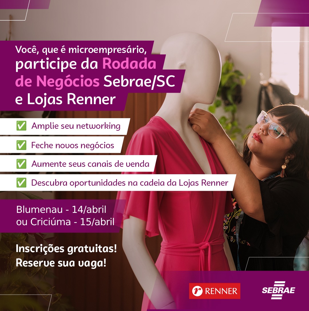 Inscrições gratuitas: https://sebrae.sc/rodada-negocios-sebrae-renner