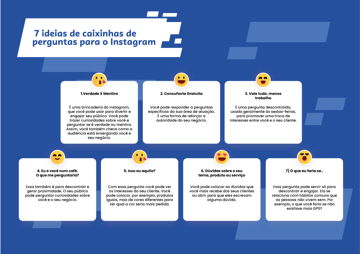 Pensando nisso, trouxemos algumas sugestões de caixinhas de perguntas que você pode usar nos seus Stories do Instagram. Aproveite!