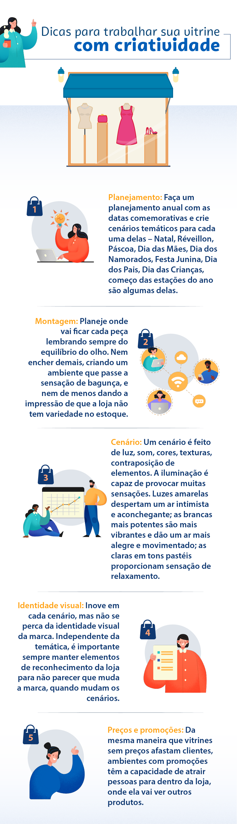 Além das dicas usadas comumente por vitrinistas, a criatividade é, sem dúvida, a principal habilidade individual capaz de tornar uma vitrine em algo atrativo. E ela depende de o vitrinista entender quem é o público-alvo da loja, portanto, um bom começo é partir dos desejos, anseios e dores do consumidor.