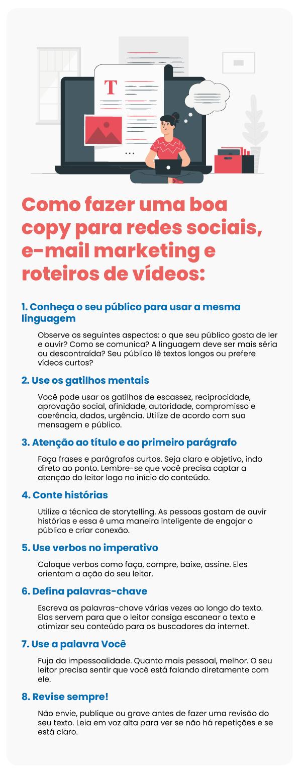 As técnicas de copywritting podem e devem ser aplicadas nas suas mensagens de e-mail marketing, ofertas, publicações nas redes sociais e vídeos. É uma escrita que visa a levar o consumidor a uma ação, de maneira criativa e com argumentos persuasivos. Lembre-se de, sempre, ser verdadeiro e honesto com o seu potencial cliente. Você pode atrair a atenção dele, mas para conquista-lo e fidelizá-lo, é preciso criar uma conexão baseada na confiança.