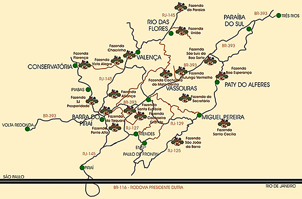 “Temos mais de dez fazendas de café do século XIX no Vale do Paraíba; a maioria aberta à visitação pública”, conta Adriana Lavinas, representante das agências de viagens no Comtur e ex-presidente do Conselho Municipal de Turismo de Vassouras. “As que estão abertas oferecem normalmente uma visita guiada, em que se mostra uma parte da história do Brasil no século XIX, como aquela fazenda funcionou etc. Como mais de 90% dessas fazendas foram restauradas, os guias acabam contando também a história delas”, continua. “Algumas fazendas oferecem produtos adicionais, como torra presencial de café, sarau histórico, almoço e jantares temáticos”.