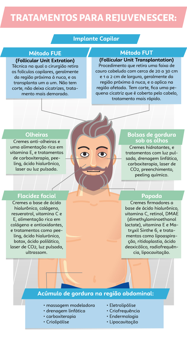 Só no Brasil, nos últimos cinco anos, o crescimento de investimentos nesse setor foi de cerca de 70%, entre 2012 e 2017, o que corresponde a um lucro de quase R$ 20 bilhões, segundo pesquisa realizada pela Euromonitor, empresa que pesquisa mercados de consumo e fornece análises de inteligência estratégica. E quando se fala nesse assunto, entram desde produtos para a pele, para a barba, sabonetes, cremes etc., como procedimentos estéticos, massagens e cirurgias. Segundo dados da Sociedade Brasileira de Cirurgia Plástica (SBCP), a procura dos homens por ações do segmento de beleza como dermatologia, estética e cuidados com o corpo, aumentou 30% nos últimos anos. Entre os mais procurados, estão tratamentos para rejuvenescer, acúmulo de gordura na região abdominal e o implante capilar, veja abaixo. É importante lembrar que todo procedimento deve ser indicado por dermatologistas.