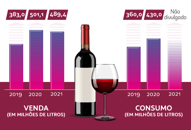Recentemente, pesquisa da empresa Ideal Consulting, que trabalha com inteligência de mercado e é especializada em alimentos e bebidas, mostrou que a venda de vinho em litros teve um salto na pandemia, passando de 383,0 milhões de litros em 2019 para 501,1 milhões de litros em 2020; e, apesar de ter havido pequena queda em 2021, com consumo de 489,4 milhões de litros, não foi visto como retrocesso, dado que o número do ano anterior foi muito positivo.
