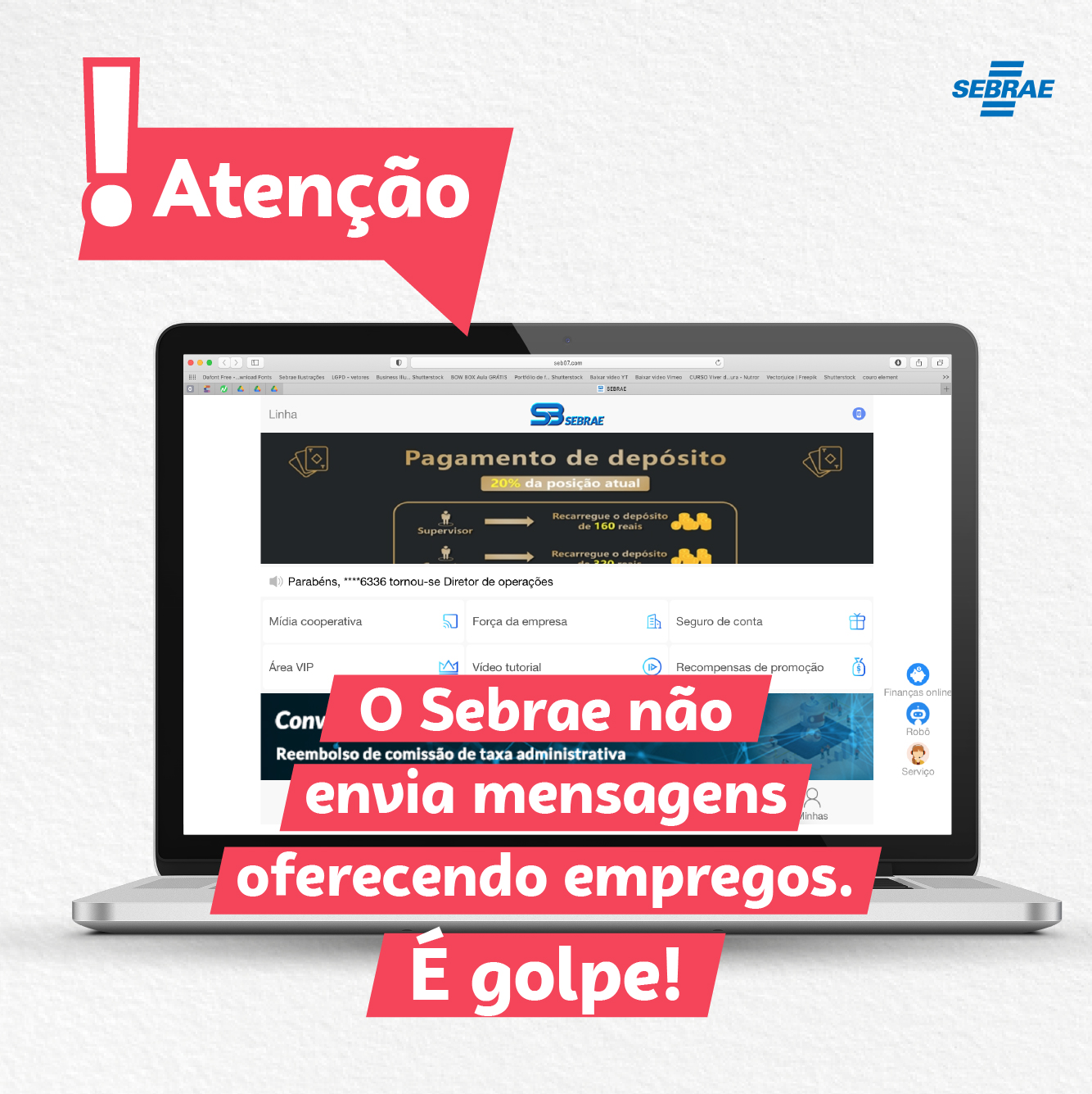 Está circulando em grupos de whatsapp uma falsa promessa de contratação de equipes para trabalhar para o Sebrae, ganhando comissão para curtir perfis nas redes sociais. O site www.seb07.com não é do Sebrae e estamos tomando todas as providências cabíveis para derrubá-lo. O Sebrae não cria esse tipo de “oportunidade”. É golpe. Caso você receba, por whatsapp ou qualquer outro meio, mensagens com esse conteúdo criminoso, utilizando o nome do Sebrae, não clique, não responda, não crie conta comercial, não aceite participar desta seleção. Se tiver qualquer dúvida, entre em contato com nossos canais de atendimento. Denuncie!