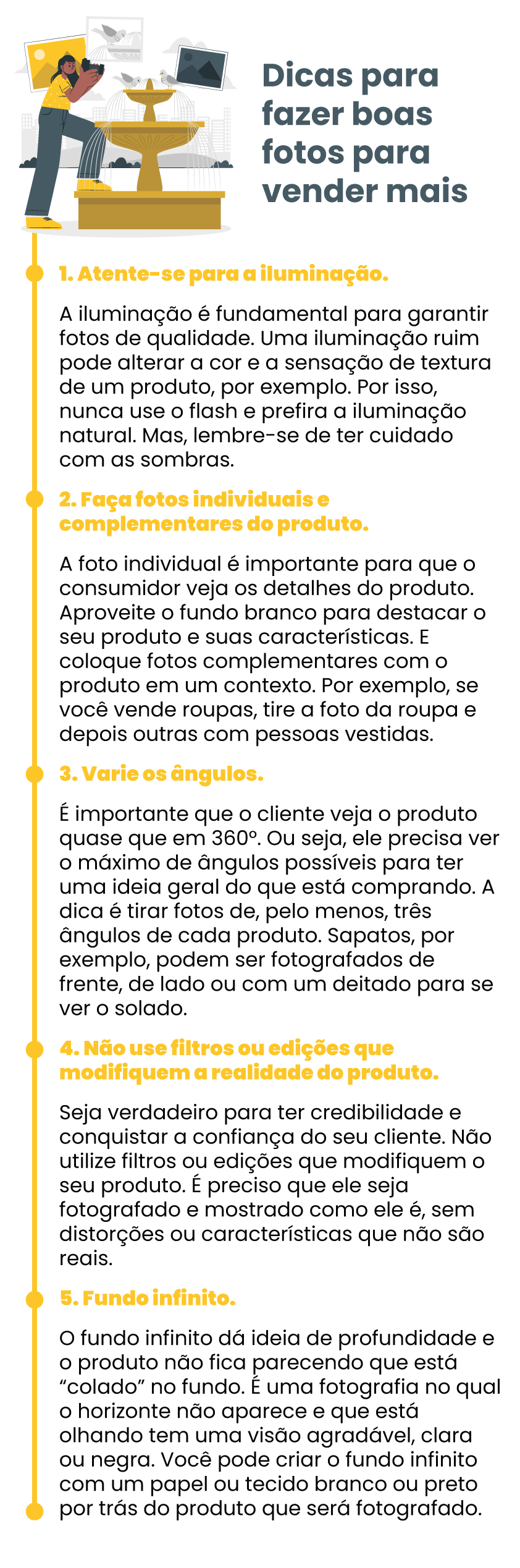As fotos devem apresentar o seu produto e conquistar o seu cliente. Confira algumas dicas para fazer fotos de qualidade e aumentar suas vendas.