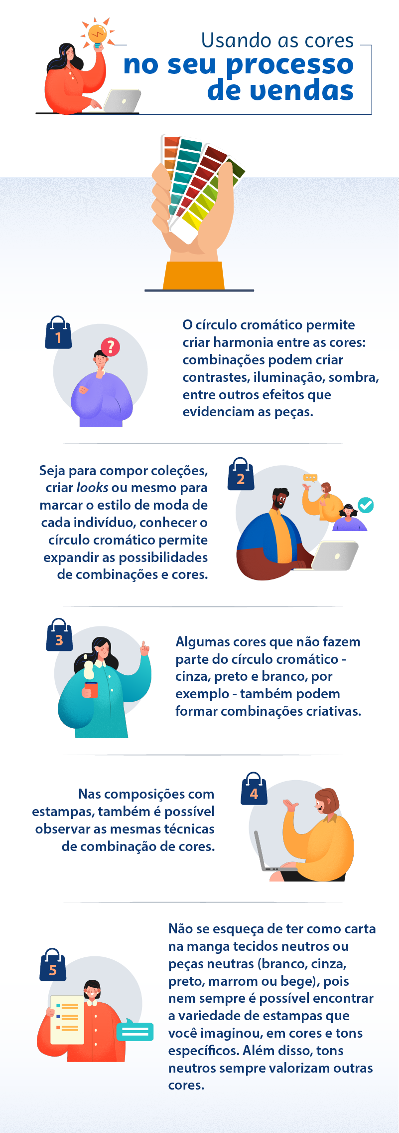 Desenvolver conhecimentos sobre combinação e uso das cores como diferenciais no processo de venda de produtos de moda pode agregar valor à venda e melhorar o relacionamento com o cliente por meio de experiências de qualidade. Além disso, é uma forma de multiplicar o uso dos produtos e reduzir a compra de estampas que acabam encalhando no ponto de venda, sem falar que pode ser uma ferramenta poderosa para compor com as estampas no uso do dia a dia e na exposição do ponto de venda. Mas você sabe como fazer isso?