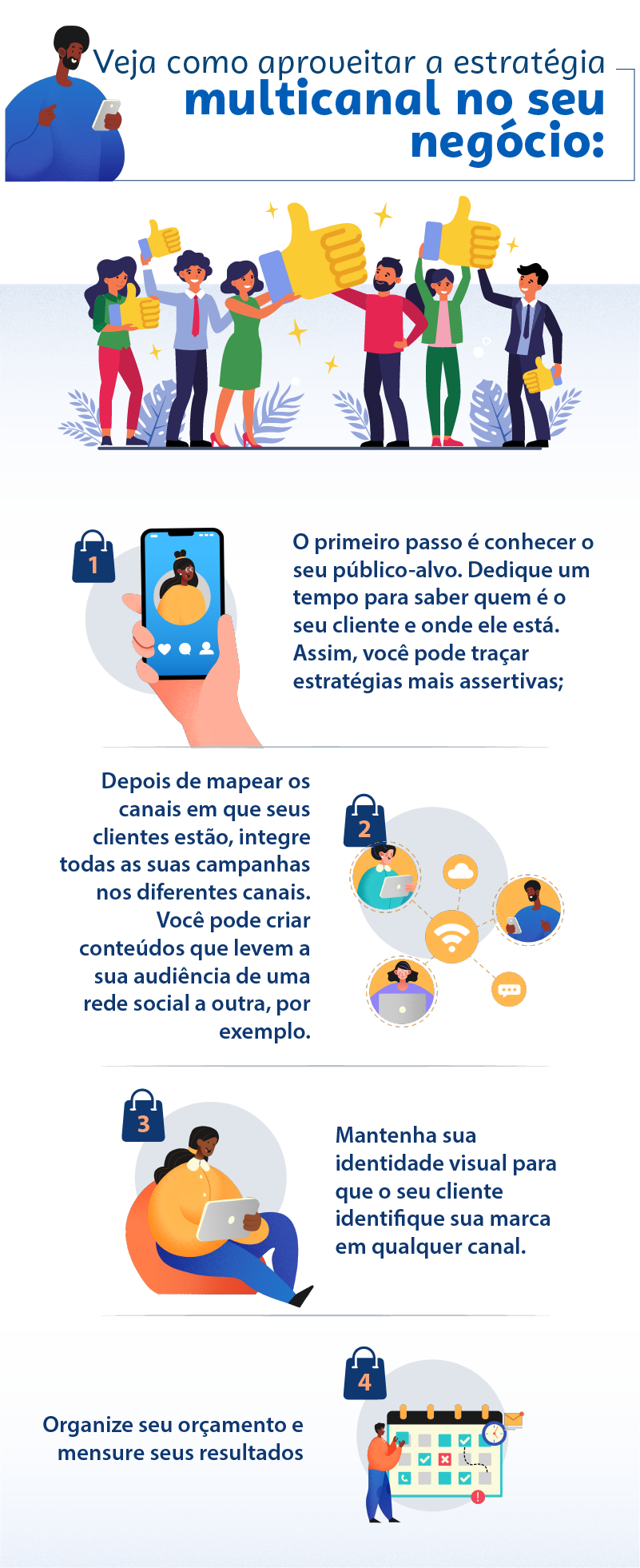 O maketing multicanal consiste no uso de estratégias multicanais, ou seja, é o uso de diversos canais, simultaneamente, para a divulgação de um produto ou serviço e, principalmente, para manter uma comunicação ativa em diferentes meios com os clientes. Não significa utilizar todas as plataformas e maneiras de divulgação, mas marcar presença onde o seu cliente está. Por isso, fique atento e pesquise quais são as redes sociais ou veículos de comunicação que mais se aproximam do seu público-alvo.