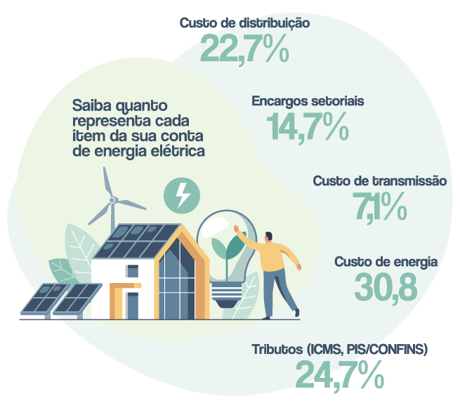 O valor da conta de energia elétrica considera os seguintes custos e tributos: