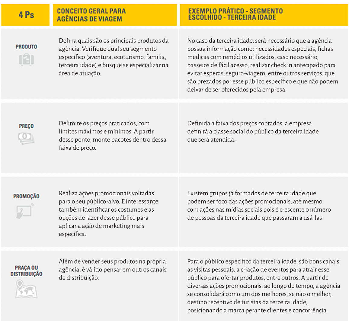 Para mostrar, na prática, como se inova em uma agência de turismo, apresentamos um modelo de planejamento baseado nos 4 Ps do marketing para uma empresa que optou pelo segmento “turismo de terceira idade”, e que tem por objetivo definir como a marca será percebida pelos clientes, ou seja, qual será o diferencial da empresa.