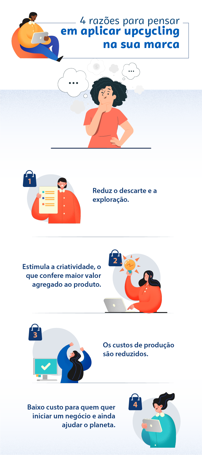 Dessa forma, o upcycling, ao reutilizar estoques e criar novos produtos a partir de algo que já existe, elimina a necessidade de compra de matérias-primas, pois a confecção é feita com estoques parados ou com a utilização de peças antigas. É possível, por exemplo, garimpar itens vintage e transformá-los em looks exclusivos ou aproveitar tecidos utilizados na criação de coleções antigas para elaborar novos produtos.