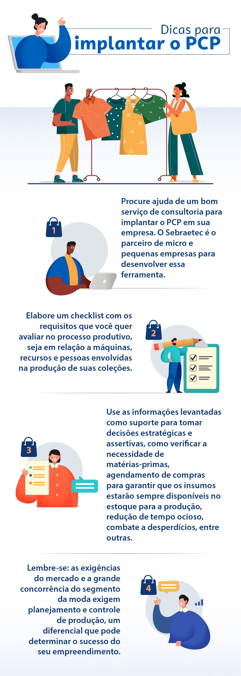 Realizar o Planejamento de Controle da Produção (PCP) vai muito além do que apenas anotar o que acontece nas etapas de produção e passar os dados para uma planilha. O PCP é uma ferramenta muito importante de efetiva gestão para as micro e pequenas empresas (MPE) e é essencial para o empreendedor ter visibilidade sobre tudo o que acontece na cadeia produtiva - no caso do segmento da moda, o processo que vai da criação ao desenvolvimento de novas coleções - até a expedição dos produtos.