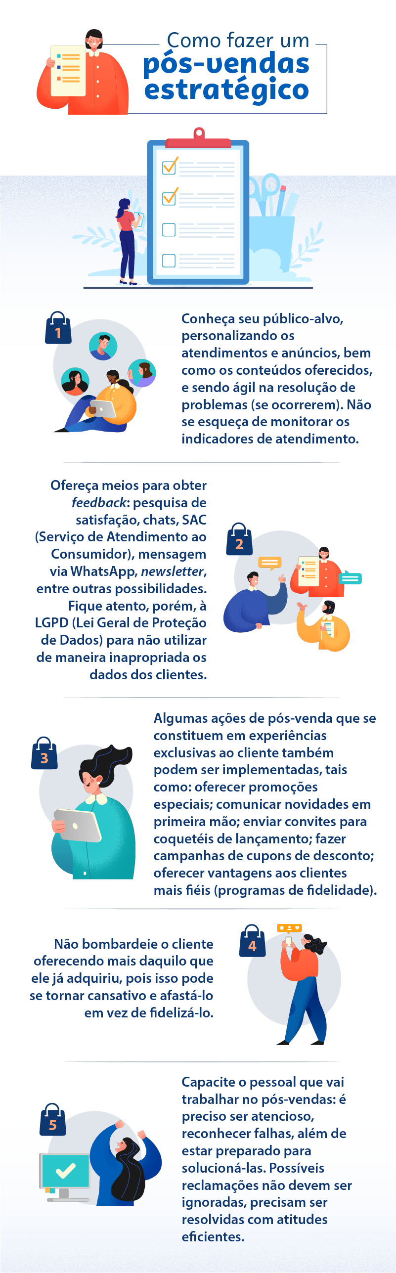 Seja qual for o tipo de pós-vendas que você adotar (veja sugestões de estratégias no infográfico), é possível ampliar os laços com o cliente de moda, fortalecendo o posicionamento da sua marca, por meio de ações como: