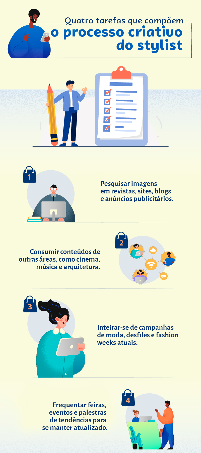 Além das tendências, o stylist vai procurar inspiração em histórias de vida, gostos e costumes de pessoas reais que dão vida às produções de cada profissional. Por isso, uma de suas características é a sensibilidade para captar novos estilos, ser observador, ter criatividade e autenticidade.