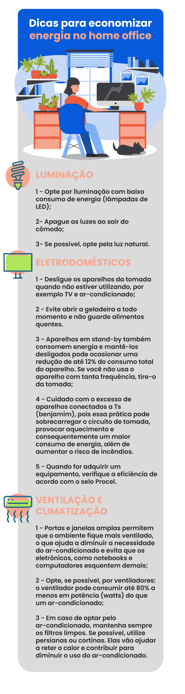 O home office já vinha sendo apontado como tendência em alguns segmentos e, com o isolamento social imposto pela pandemia de covid-19, tornou-se realidade para muitos pequenos empresários e funcionários de empresas. Conforto para o profissional aliado ao aumento das despesas em casa, em especial com a energia elétrica, que teve expressivo aumento nos últimos meses. Para essa dinâmica continuar dando certo, é preciso reduzir custos e otimizar os recursos, afinal, o home office e o trabalho híbrido vieram para ficar.