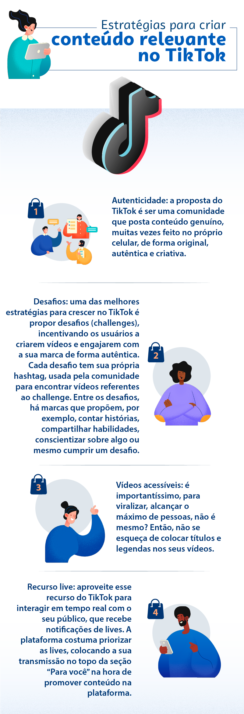 É possível, além dos vídeos, realizar lives: os usuários que estão assistindo podem dar presentes (doações em dinheiro) para o criador de uma live. Quando a live chegar ao fim, o criador vai ficar com 50% do valor doado, enquanto o restante dos presentes vai para o TikTok e as app stores. Veja no infográfico algumas dicas e estratégias para criar conteúdo relevante na rede, produzir tendências e posicionar a sua marca.