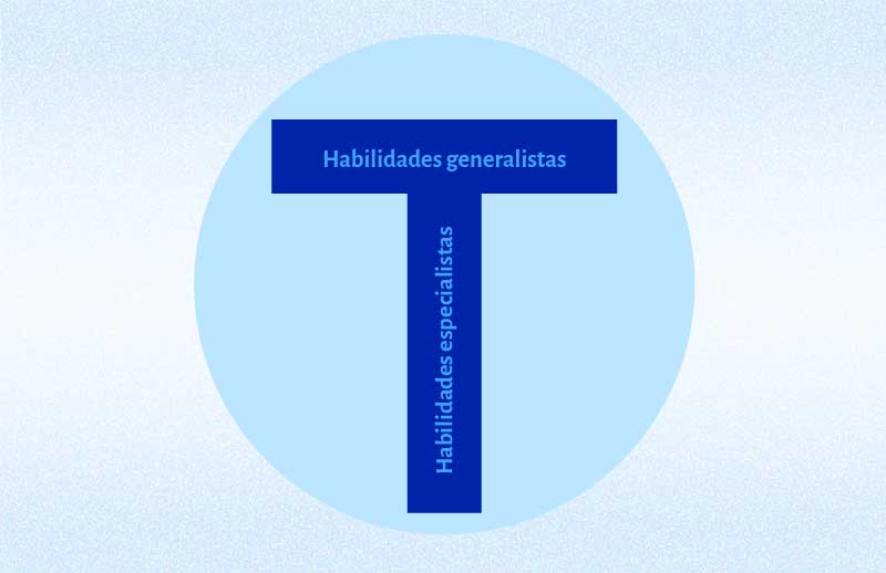 O perfil T-shaped recebeu este nome por ser representado pela letra T. A linha vertical indica que ele é um especialista e a linha horizontal representa outros conhecimentos e habilidades generalistas.