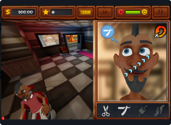 No painel à direita siga as instruções para realizar o serviço pedido pelo cliente. Dentre as opções estão corte de cabelo, barba, pintura e massagem. Utilize o mouse para realizar as ações.