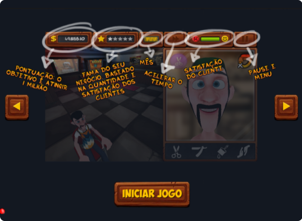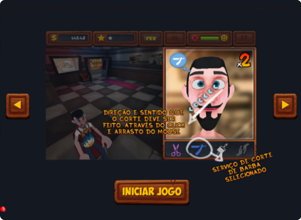 Utilize o botão esquerdo do mouse para levar o cliente para a cadeira e ao finalizar o corte. Clique e arraste para realizar os serviços de corte de cabelo, barba, tintura e massagem. Para escolher entre os serviços utilize o mouse ou os botões 1, 2, 3 e 4.