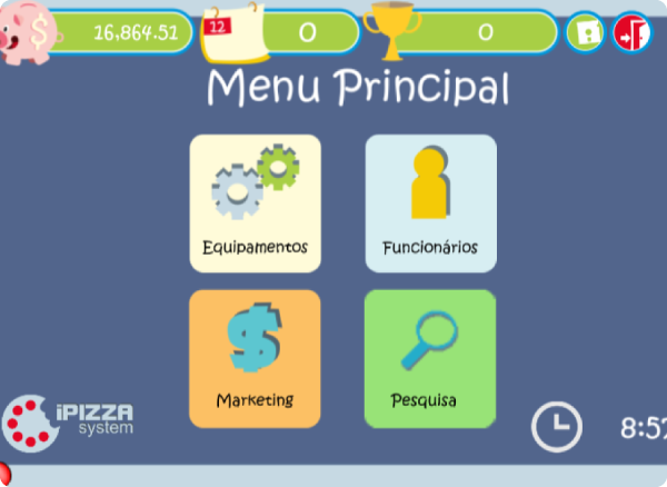 Escolha onde será sua pizzaria e comece seu negócio! No mapa inicial confira sua pontuação, turno, saldo e vá ao mercado para comprar ingredientes.