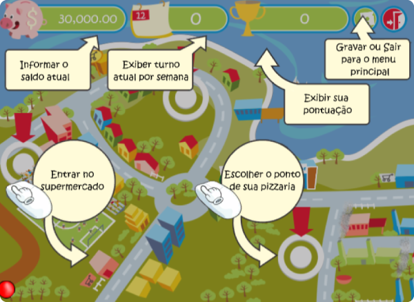 Utilize o botão esquerdo do mouse para realizar todas as atividades dentro e fora de sua pizzaria. Quando estiver montando suas pizzas utilize o botão direito do mouse para posicionar os ingredientes.