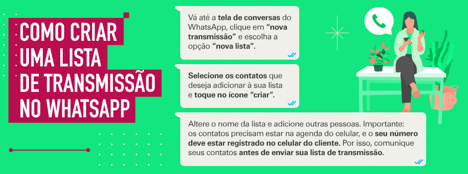 - Aproveite os recursos das listas de transmissão: as listas de transmissão são como grupos de WhatsApp, com a diferença de que os clientes recebem as mensagens de forma individual. O conteúdo é enviado para todos os contatos selecionados de uma única vez. É possível criar listas de transmissão com até 256 contatos. Veja como é fácil criar a sua: