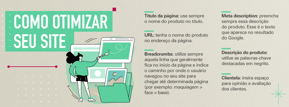 Por isso, investir nas técnicas de Search Engine Optimization (SEO) — que otimizam sua posição nas ferramentas de busca, como Google, Bing e outros — é essencial para um e-commerce bem-sucedido. Assim, você, empreendedora que atua com e-commerce, pode garantir mais vendas, fidelizar e atrair novos clientes.