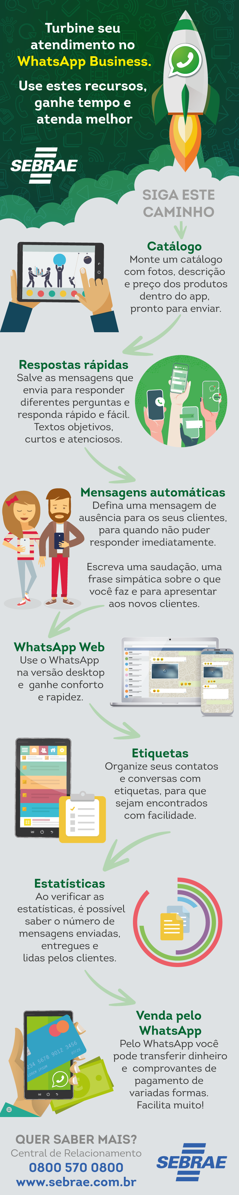 Infográfico mostra as possibilidades oferecidas pelo WhatsApp Business. Ganhe tempo e atenda melhor.