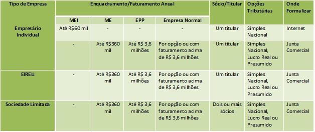 O quadro abaixo resume as características principais dos tipos de empresas mais comuns no Brasil -> Veja aqui