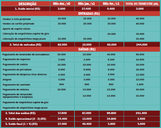 Neste fluxo de caixa, foram consideradas no primeiro mês as entradas originadas do capital próprio e de terceiros, que custearam os gastos das novas aquisições, como: reforma, compra de móveis, mercadoria, despesas fixas. Gerou saldo positivo que suportou as oscilações dos meses subsequentes, principalmente quando apresentou saldo operacional negativo no último mês do trimestre.