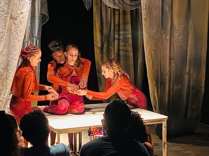 Espetáculo do Núcleo Atmosfera também esteve no primeiro dia de programação do Mobiliza São Luís. Realizado no recém-inaugurado Xama Teatro, no bairro Araçagy, a obra trouxe performatividades remotas, criadas pelos atores Rosa Ewerton Jara, Marina Corrêa, Gabi Miguel e Renato Guterres. O projeto é desenhado sob os universos visuais de Marlene Barros e Marçal Athayde e explora as associações entre criador e criatura e também forma e conteúdo. Esses vínculos, em si, carregam sentimentos de reconexão entre corpos e presenças.