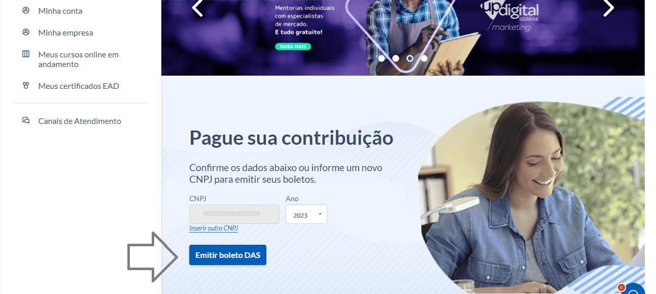 3 - No seu mural, abaixe o mouse e veja a parte que aparece “Pague sua contribuição”, com seu CNPJ e o ano do seu negócio, clique em “Emitir boleto DAS”. Se não tiver o CNPJ ou você quiser outro ano, é preciso editar e cadastrar seu negócio.