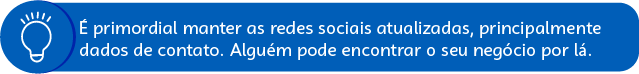 Essa dica é válida para qualquer empreendimento atualmente: é importante ser visto no mundo digital. Para isso, você pode acessar alguns conteúdos nossos sobre Google Meu Negócio, Instagram e outros canais de venda online.
