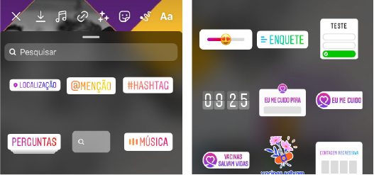 Algumas ferramentas de stickers não precisam ser explicadas, como localização, horário, música, gif e temperatura. Por isso, vamos falar das outras que podem ser utilizadas como forma de interação com assiste.