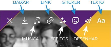 As funções de “baixar” e "música'' falam por si, uma serve para salvar aquele story na galeria do seu celular e outra para colocar músicas na sua publicação. Já a função “link”, possibilita direcionar aquele story para algum vídeo postado no seu perfil e se você tiver mais de 10.000 seguidores, pode direcionar para um link da web.