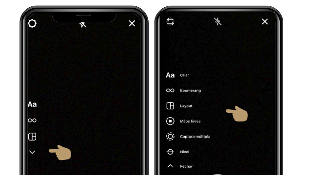 Ao abrir o story, você encontra alguns ícones do lado esquerdo, clicando na seta para baixo é possível visualizar o nome e alguns outros recursos. Neles, você consegue acionar diferentes funções na hora de gravar os seus stories: criar, boomerang, layout, mãos livres, captura múltipla e nível.