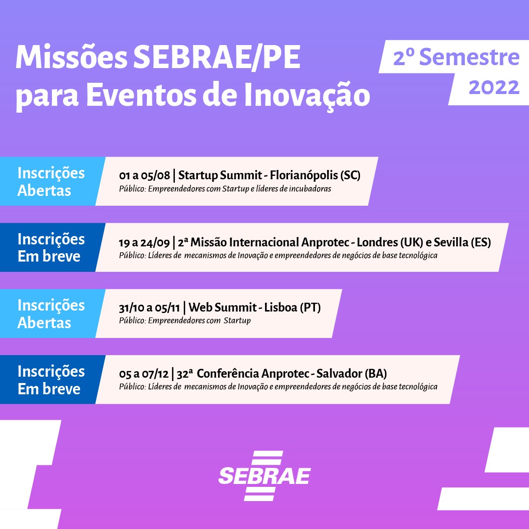 Dentro da estratégia de ampliar o conhecimento em gestão e a geração de negócios inovadores no estado, a instituição preparou uma agenda de missões para eventos de inovação que acontecerão no Brasil e fora do país, destinada a empreendedores de startup e negócios de base tecnológica e lideranças de mecanismos de inovação de Pernambuco.