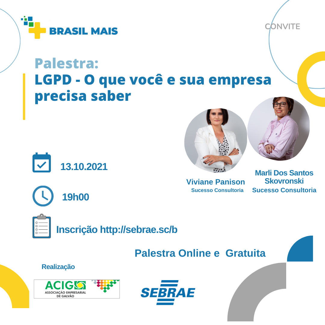 Para esclarecer as dúvidas dos empresários sobre a implementação dessa legislação será realizada palestra on-line e gratuita “LGPD – O que você e sua empresa precisam saber” na próxima quarta-feira (13), às 19 horas. A iniciativa é do Sebrae/SC e da Associação Empresarial de Galvão (ACIG).