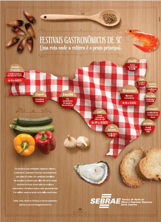 Em 2015, os festivais gastronômicos são realizados em 8 regiões de Santa Catarina: Grande Florianópolis, Norte, Vale do Itajaí, Serra, Foz do Itajaí, Meio Oeste, Oeste e Extremo Oeste. “Cada festival valoriza a peculiaridade cultural de cada região e esse é um dos principais atrativos desse projeto, que une a gastronomia e a cultura”, comenta Cristina.