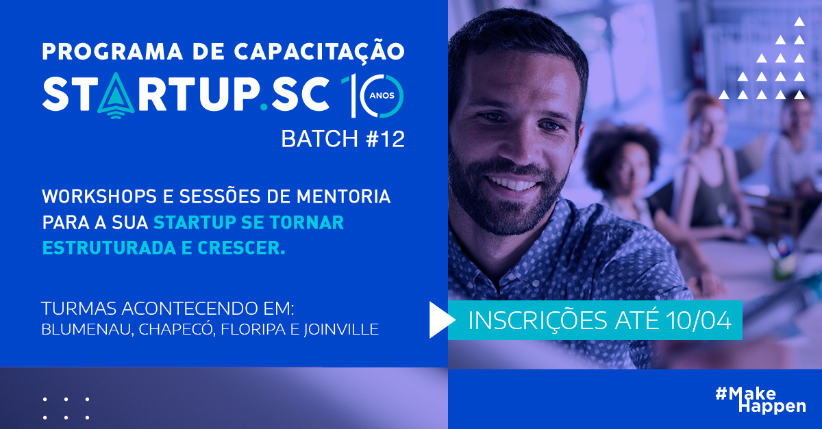 O Programa de Capacitação Startup SC, iniciativa do Sebrae/SC, está com inscrições abertas para a sua 12ª edição, que terá turmas em Blumenau, Chapecó, Joinville e Florianópolis. As startups de Santa Catarina podem se inscrever entre 10 de março a 10 de abril para o programa, que este ano terá duração de sete meses e oferece, além de capacitação, acesso à rede de empreendedores do ecossistema de inovação catarinense.